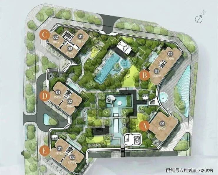 1E栋(1栋五单元)-43层:均为3梯2户,约302㎡,一层两户。