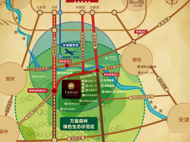 卓立布鲁克林别墅项目区紧临廊坊市永清县城区西南,周边风景宜人,临近永清万亩国家森林公园。临近永清城区,各项配套极为完善,永清人民医院、永清一中等设施近在咫尺,828路公交车直达。项目后期规划占地1000亩,包括主题生态园、度假村、观光、采摘、垂钓园、生态休闲农庄和运动休闲公园等。项目由永清县福润房地产开发有限公司开发
