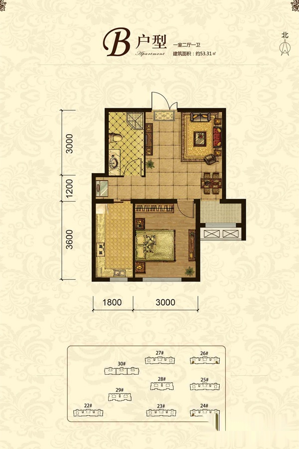 1室2厅1卫-24#26#楼B户型53.31㎡一居