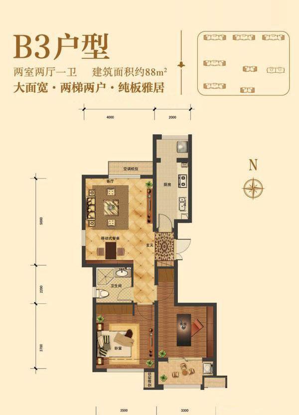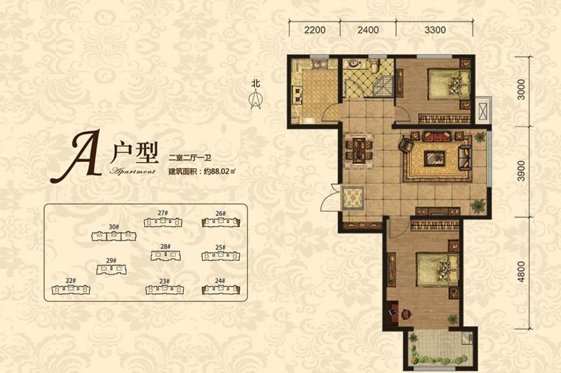 2室2厅1卫-24#26#楼A户型88㎡两居