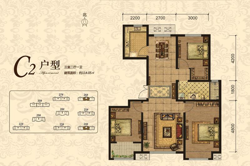 3室2厅1卫-24#26#楼C2户型114㎡三居