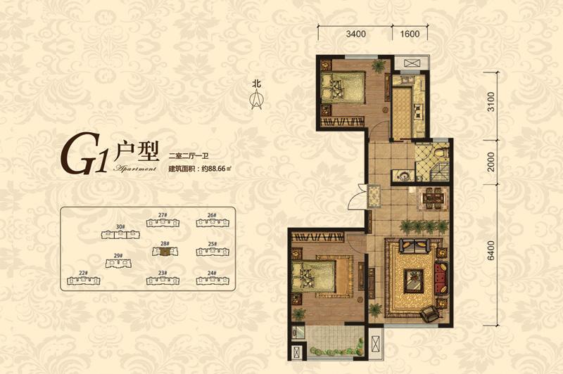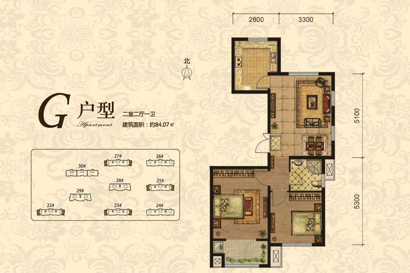 2室2厅1卫-22#23#25#27#楼G户型84㎡两居