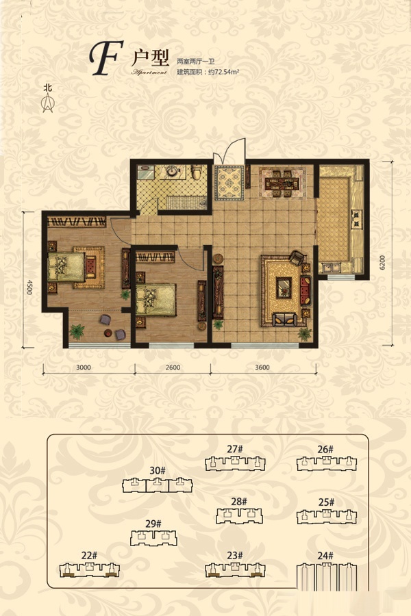 2室2厅1卫-22#23#楼 F户型 72.54㎡两居