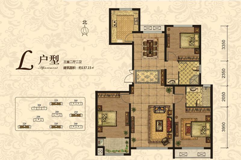 3室2厅2卫-22#23#25#27#楼L户型137㎡三居