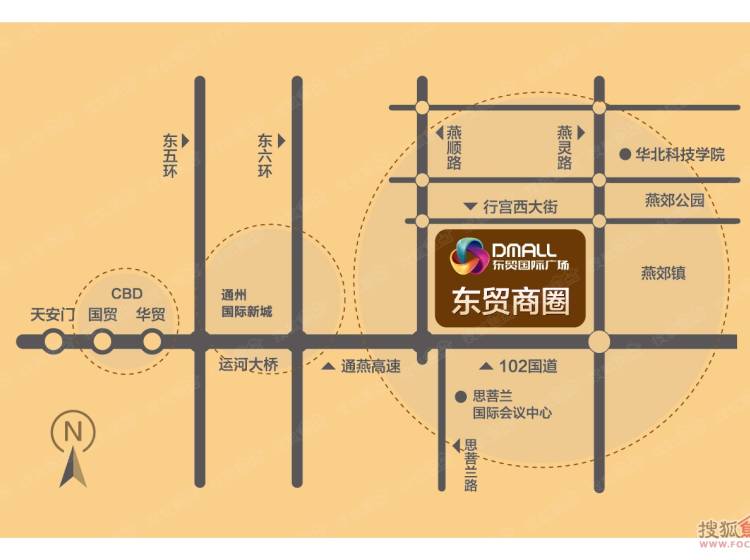 综合商场 :南侧是121万㎡成功时代大广场,成功广场南侧的燕达国际健康城总建筑面积约为120万平方米,西北侧是总建面约为68万平方米的汇福国际健康城,涵盖五星级度假酒店、会议酒店温泉疗养;东侧是规划中的兴达广场,形成了“三角布局图”,为东贸成为商圈核心的商业氛围奠定了良好的基础。南、北京华与华堂两大国际级高尔夫球场势必带来高端消费的商机。