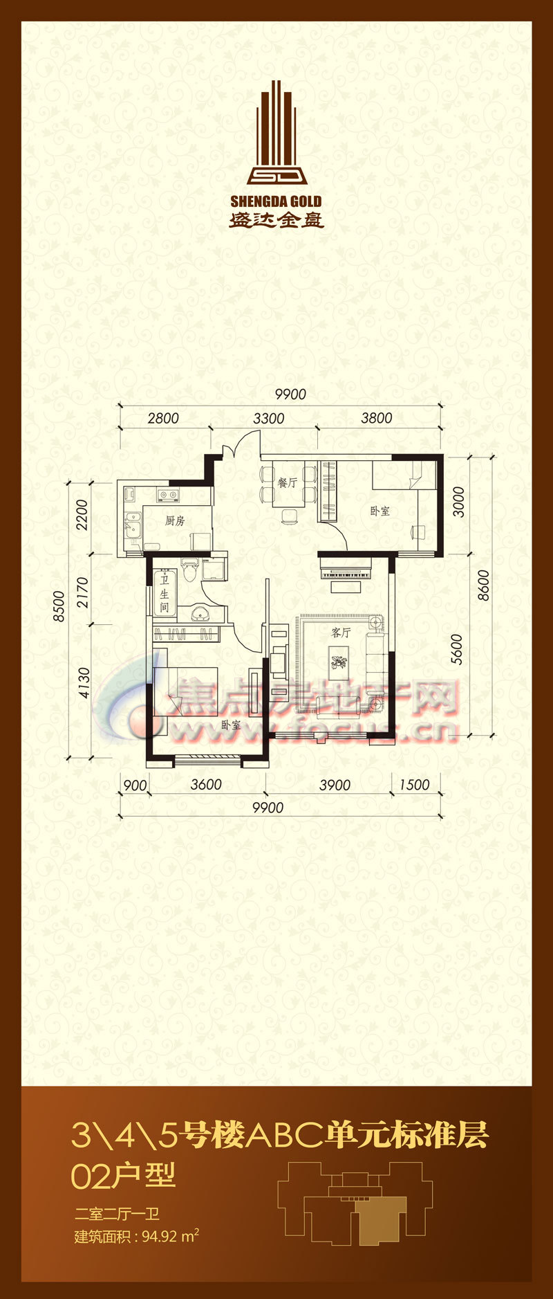 2室2厅1卫-盛达金盘3#、4#、5#楼ABC单元标准层02两室两厅一卫94.92平方米