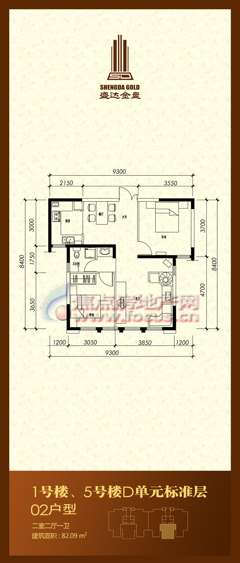 2室2厅1卫-盛达金盘1#、5#楼D单元标准层02两室两厅一卫82.09平方米