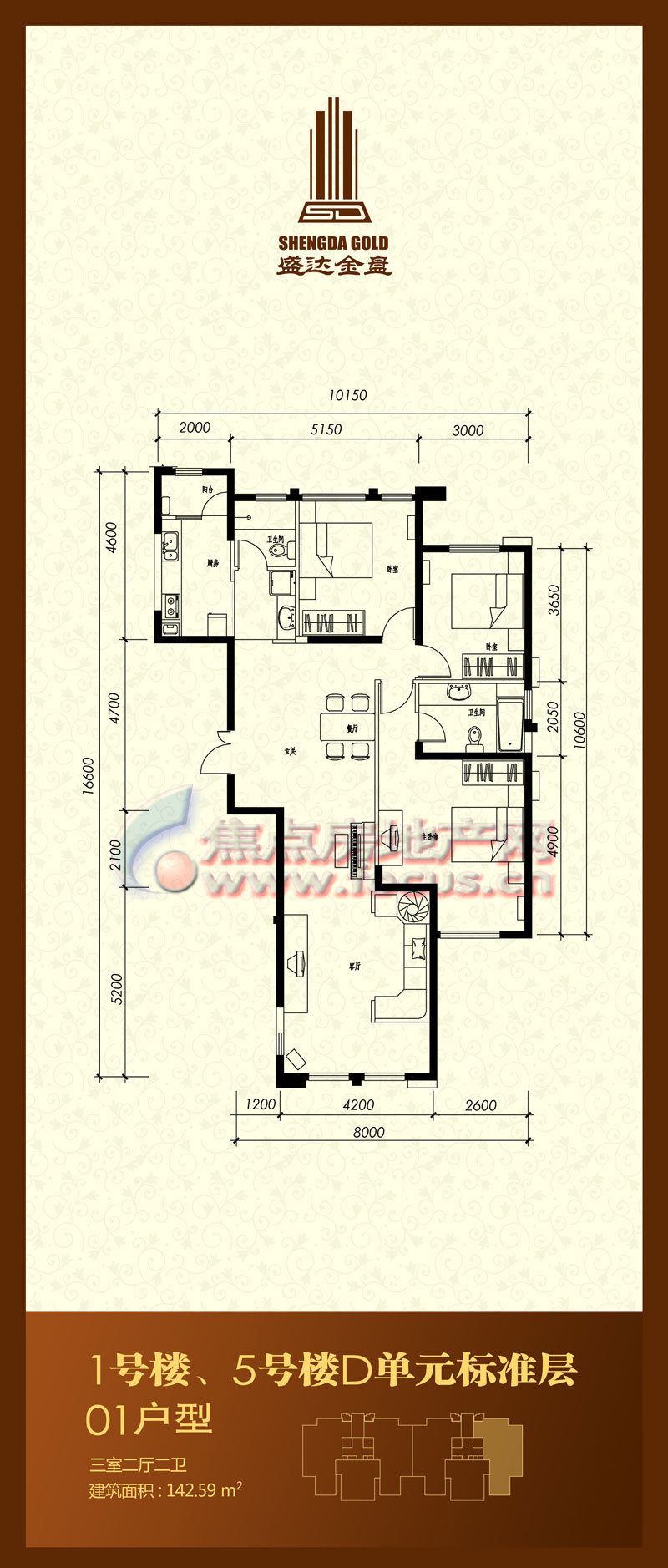 3室2厅2卫-盛达金盘1#、5#楼D单元标准层01三室两厅两卫142.59平方米