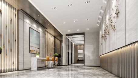 入户大堂是星级装修入户大堂,装修设计风格为国际现代设计风格,采用深灰色为主基调,运用金属,石材,镜面玻璃的经典搭配。