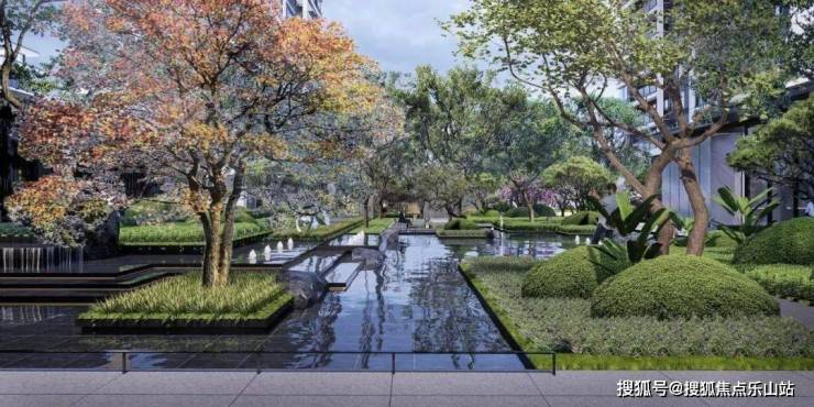 约62米的中轴立体景观带,带来步移景异的观景归家动线,端庄典雅与灵动自由并序、人与自然互动、景观与功能交融的园林景观增加了诗意的归家体验;