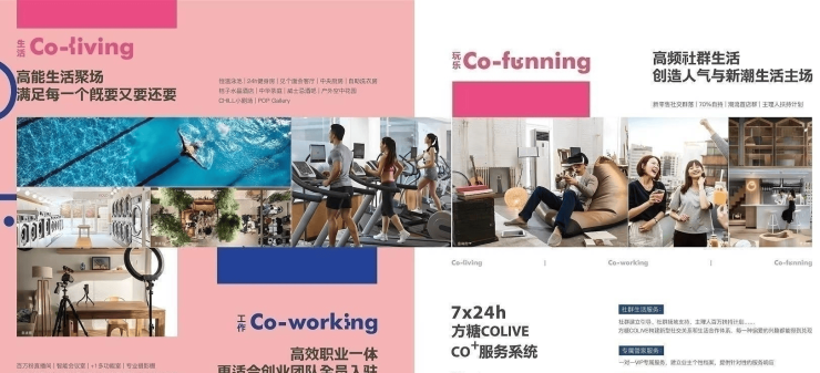 项目核心价值——成都首个COLIVE社区COLIVE是全球核心都会区正流行的【带资产属性的生活产品】方糖COLIVE以co-working、co-living、co-funning三大体系,为年轻人群提供“职住一体+兴趣社交”的新社区生活模式