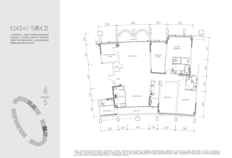 户型:主推210㎡三房三卫、243㎡及280㎡五房四卫,全系2T2纯板式小高层,精装交付(标准约3.98元/㎡物业费)。