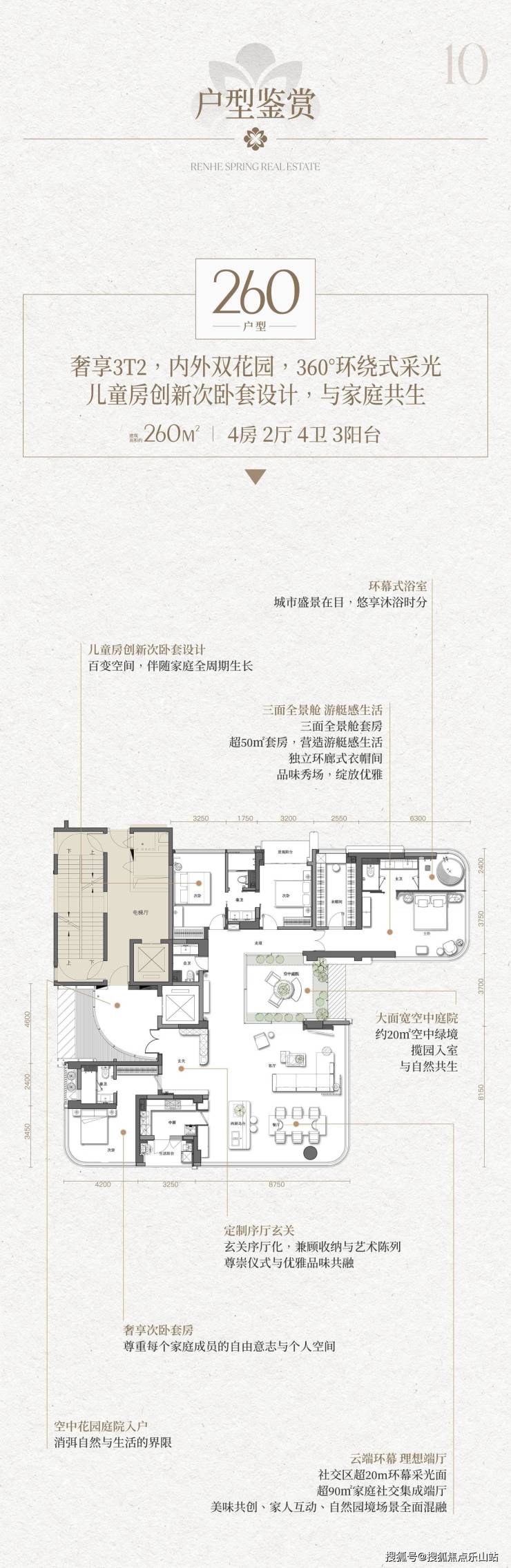 5、创新户型设计,空间尺度奢阔:200-260㎡纯大平层,2T2/3T2 梯户比,独立电梯入户,层高 3.3-3.6 米。270° 环幕端厅、LDKB 一体化空间,楼王 360° 环绕采光、双空中花园,得房率约 94%,居住私密性与实用性兼备。