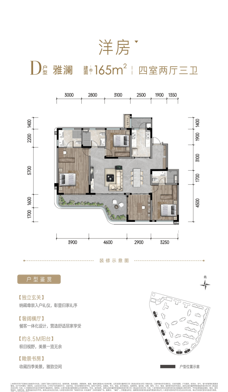 165㎡:四室两厅四卫,双套房设计,6.8米横厅