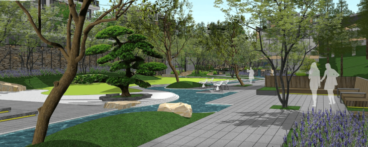 4、多重风格景观组团,营造诗意居住体验“一门一脉两苑五坊”景观布局,在保留原生景观植被的基础上,引用传统古诗词中的“水、石、林、云”意向元素,将现代生活方式与诗意精神境界完美交融,打造超脱俗世繁华之外的人生理想居所。