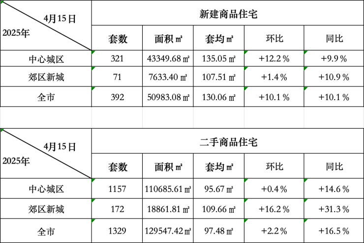 成都2025年4月15日新建商品住宅全市成交套数392套、共计面积50983.08㎡、套均130.06㎡、环比+10.1%、同比+10.1%;(其中中心城区成交321套、共计面积43349.68㎡、套均135.05㎡、环比+12.2%、同比+9.9%,郊区新城成交71套、共计面积7633.40㎡、套均107.51㎡、环比+1.4%、同比+10.9%).