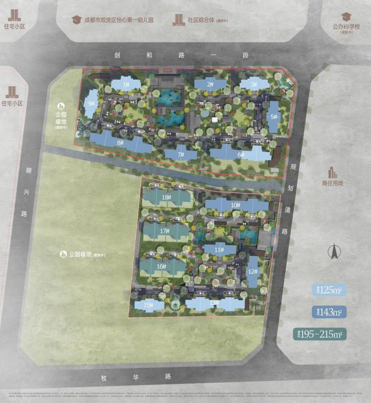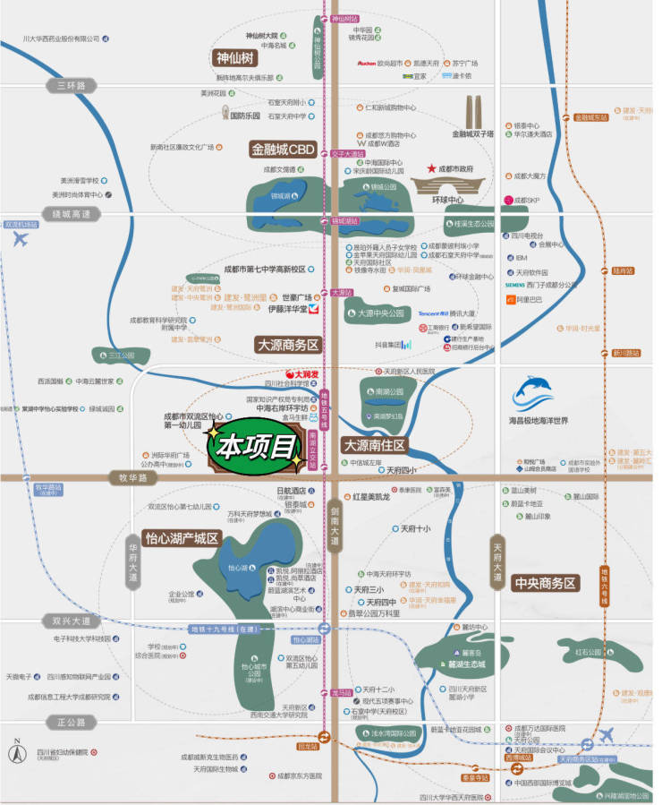 【交通配套】🚇——四横三纵双地铁 出行畅达四方——南北:剑南大道、华府大道、天府大道东西:三环路、四环路(绕城高速)、华府大道、五环路(牧华路)项目紧邻剑南大道/牧华路主干道5 号线南湖立交站,500米左右,可到达向北 5 站即可到达大源板块,7 个站即可到达金融城;向南 1 个站即可到达怡心湖换乘 19 号线,4 个站到达双流机场,8 个站到达天府国际机场;向南 3 个站即可在回龙站换乘 6 号线