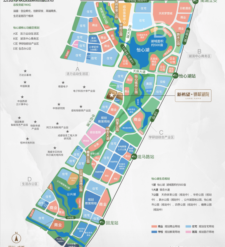 商业休闲:成都第三座银泰、中国西南首家-日航酒店(在建中)、蔚蓝文化艺术中心(在建中)、阿丽拉酒店(规划中)、凯悦尚萃酒店(规划中)、湖畔书店-怡所(在建中)等