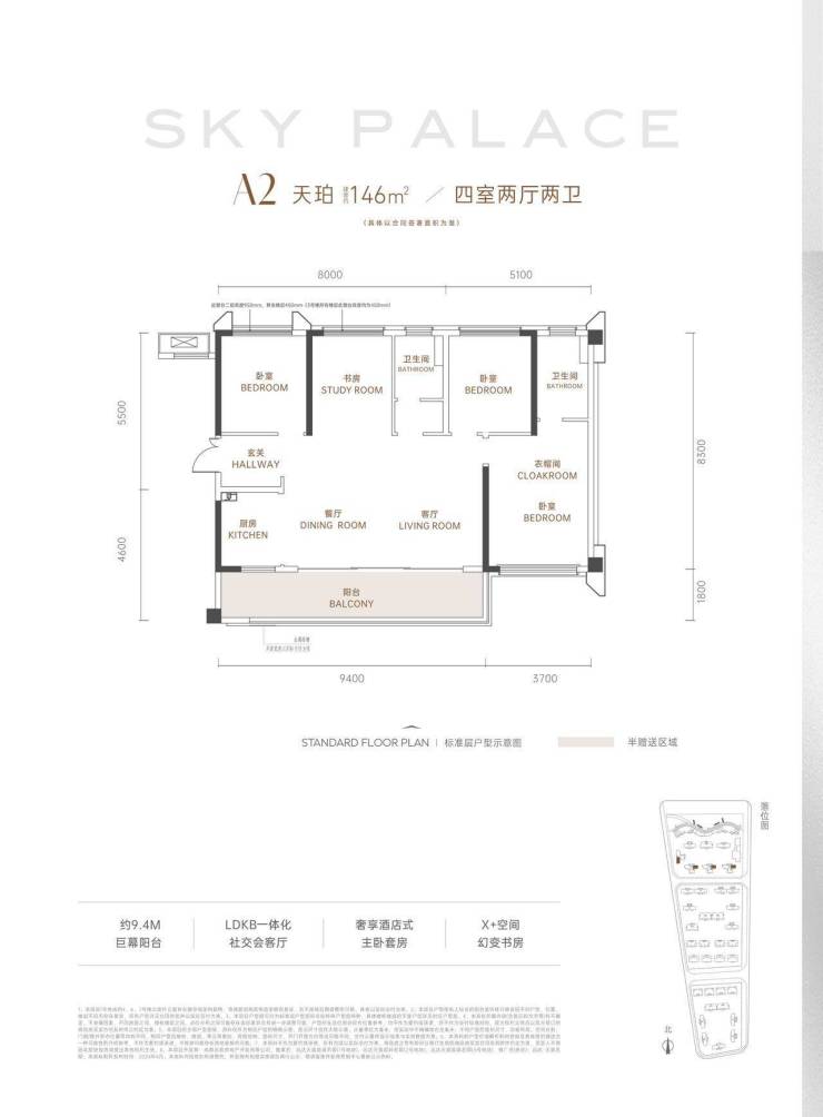 A2 – 天珀(建面约146㎡ 四室两厅两卫)🌆约9.4M宽奢阳台,幻变空中花园🌆LDKB气派会客厅,多元社交空间🌆酒店式主卧套房,诠释奢居理想🌆独立灵动书房,栖息身心的理想国
