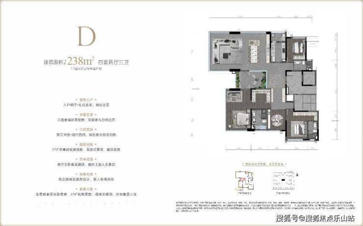 项目主打143-238㎡大平层改善户型,亮点如下: