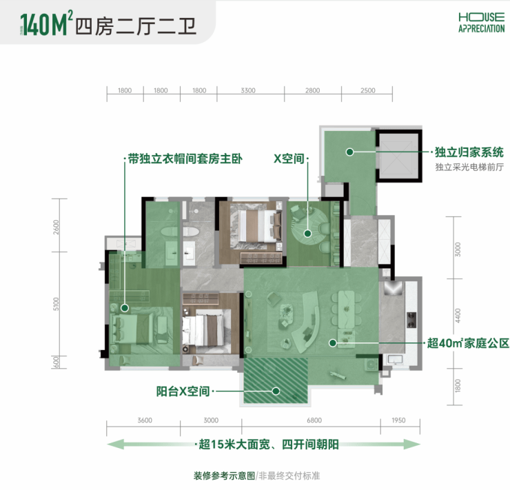 ※建面约140㎡四房,超级公区兼顾家庭全周期建面约140㎡的户型,将空间上限的突破感进一步强化。优秀的独立归家系统,标配全明设计电梯前厅,且为双面转角采光,空间开阔。这是一个典型的大面宽产品,横向面宽超过15米,卧室、客餐厅实现四开间朝阳,每一个房间都尽可能实现了“阳光平权”。室内的LDKB空间,形成了面积约48㎡的超级公区,使用感接近180㎡的大平层,同时也带来了270°的环幕景观视野。
