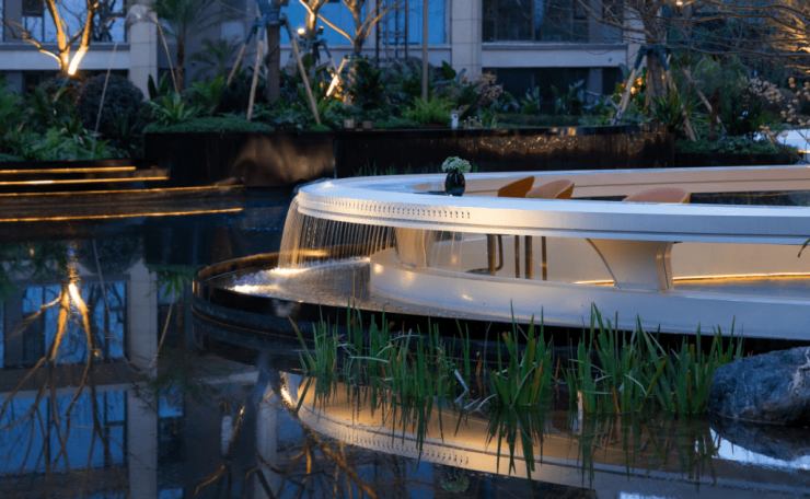 中庭园林以湖屿森境为理念,森林为底,引水环绕,“一湖一桥双庭三境”,用艺术放大自然,让建筑与自然相融生长。