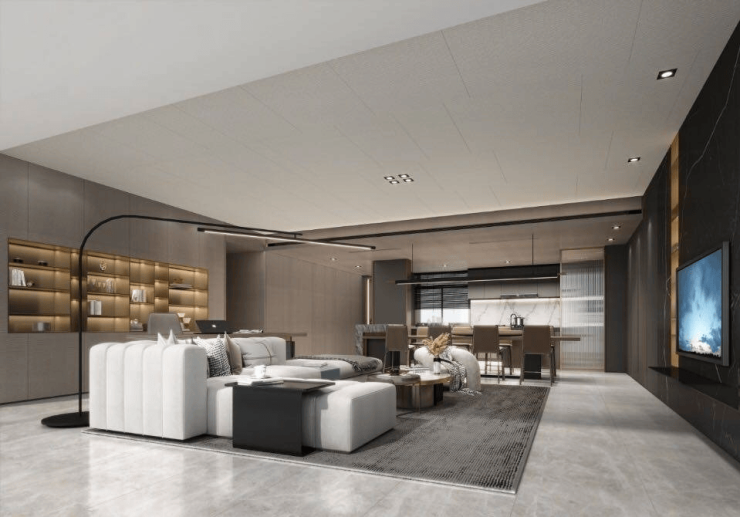 以黑白灰为基调,选用岩板、实木等抗污耐磨材质;