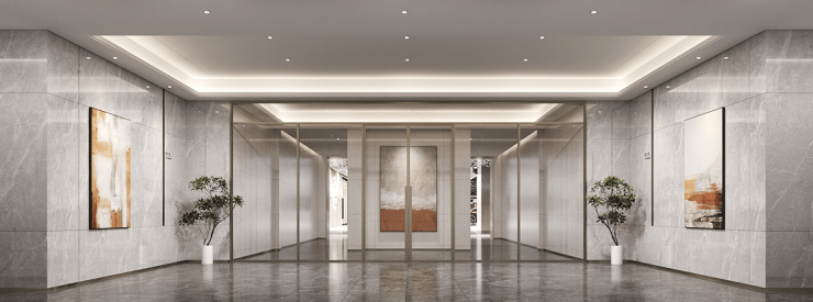 大堂与泛大堂雕琢绝不重复花纹的定制岩板景墙搭配大理石质感墙面与地面短短的归家体系上造就精工打造匠心