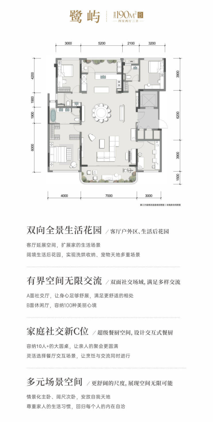 产品主张03:室内场景化功能尺度满配,有限空间无限交流为主城西家庭生活方式定制,超级餐厨空间容纳10人+的大圆桌,让亲人的聚会更圆满:双面客厅生活,A面社交B面休闲;情景化主卧、阔尺次卧,让每位家人均享受舒适生活,