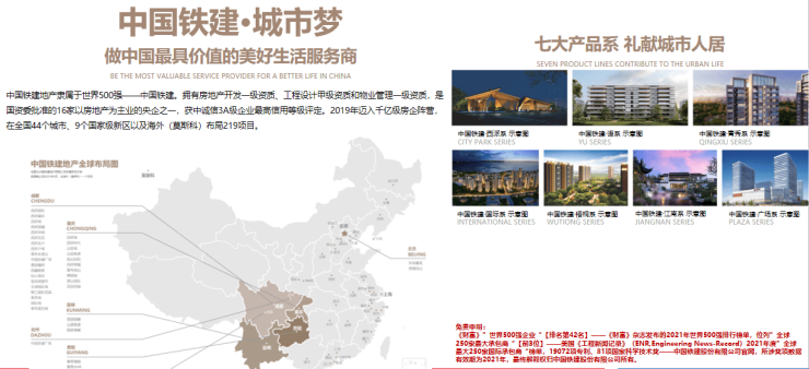 中国铁建前身为中国人民解放军铁道兵,2007年成立中国铁建股份有限公司,2008年在香港上市,目前在全国44个城市、9个国家级新区以及海外(莫斯科)布局219项目,2021年《财富》“世界500强企业”排名第42位、“全球250家最大承包商”排名第3位、并拥有4大奇迹作品,380天竣工人民大会堂,成昆铁路,世界第一条磁悬浮商业运营线,青藏铁路,中国铁建是全球最具实力、规模的特大型综合建设集团之一