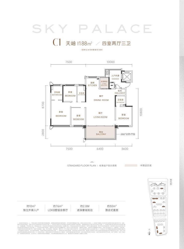 C1 – 天岫 (建面约188㎡ 四室两厅三卫)🏙约10㎡独立外廊入户,让归家更有仪式感🏙约76㎡奢尺双厅,生活进阶的极致享受🏙双套房设计,营造更自在的家庭氛围感🏙约2.8M进深阳台,轻松打造全龄休闲场