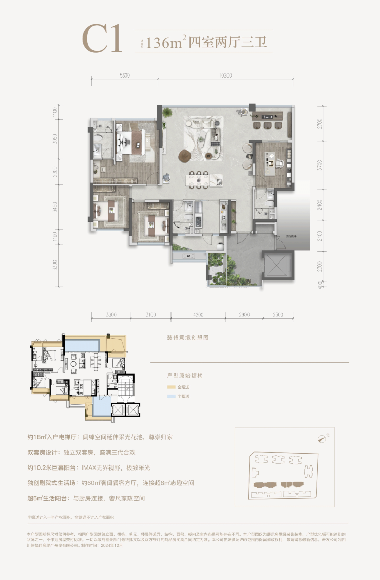 121%得房率:95㎡做三房,136㎡四房带10.2米阳台