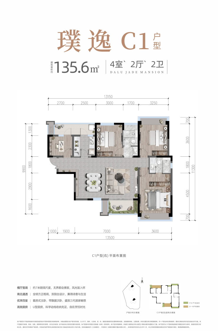 户型核心亮点景观视野116㎡三房双卫+约6.2米南向双阳台体育公园全景135㎡四房双卫+独立玄关+明厨明卫河景+公园双景全系南北通透,零遮挡板式布局