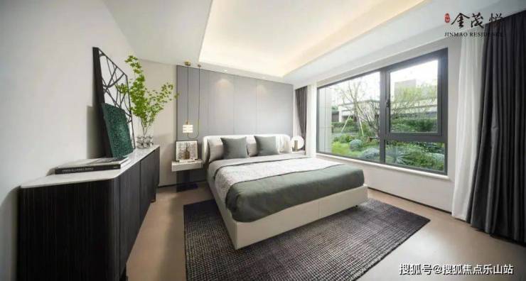 项目采用了现代东方风格,整体立面简洁大气,入户以部分米色石材为门头,搭配灰色铝板线条勾勒出框体形象;灰色和米黄色的大面积仿石漆,一看就是经典的“金茂风”;建筑屋顶采用了中式坡屋顶,四四方方的小角塑造了东方气韵。