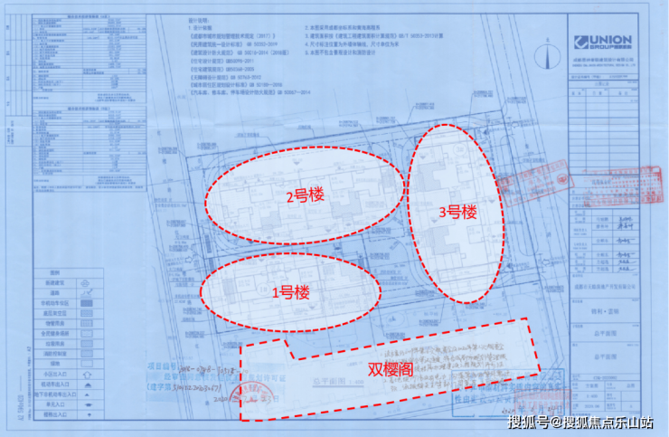 1、2号楼为南北朝向,3号楼为东西朝向,1号楼南侧紧邻的双樱阁是两栋高层,这样布局也能让更多房源不会产生跟双樱阁的近距离对视。