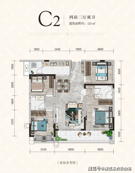 建面约125㎡户型为小高层中唯一的四房户型,布局也非常方正,且景观阳台开间约7.4米,连接客厅和主卧,能保证主卧的居住舒适度。