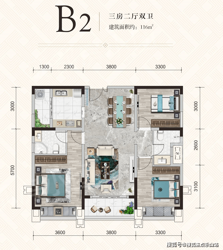 想要南北朝向的话,可以选择2号楼上的约116㎡及约120㎡户型: