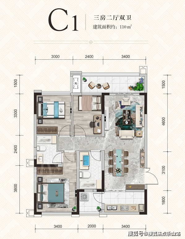 建面约110㎡户型朝向东北,户型方正,布局合理,适合预算不高的刚需家庭;