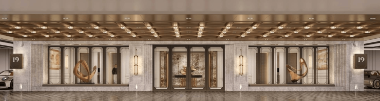 殿堂级归家礼序: 从高奢酒店大门、艺术光厅到精奢地下大堂,每一步皆诠释威仪与尊贵。
