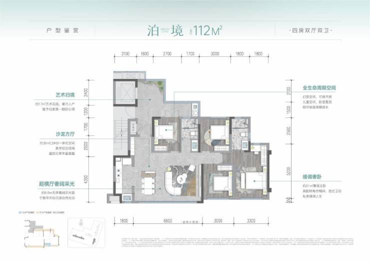 超阔空间:建面约112㎡享超配4房大方厅,采用LDKB一体化设计,消弭空间界限,演绎生活丰盈场景,巧妙打通书房空间,双阳台对望室内更加通透;建面约133㎡享4房大双厅奢阔主卧,幻变空间可做书房、棋牌室,满足家庭全生命周期情景所需。