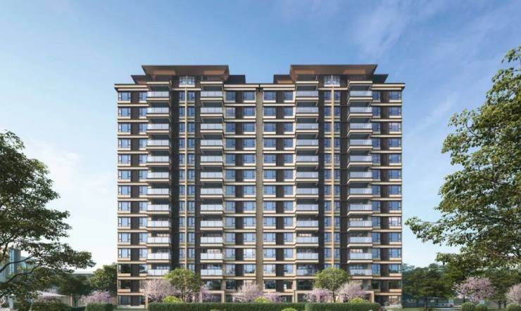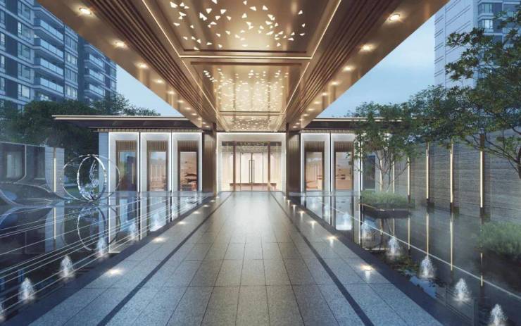 建筑外立面采用新亚洲风格,米黄色基调+铝板线条,质感高端。