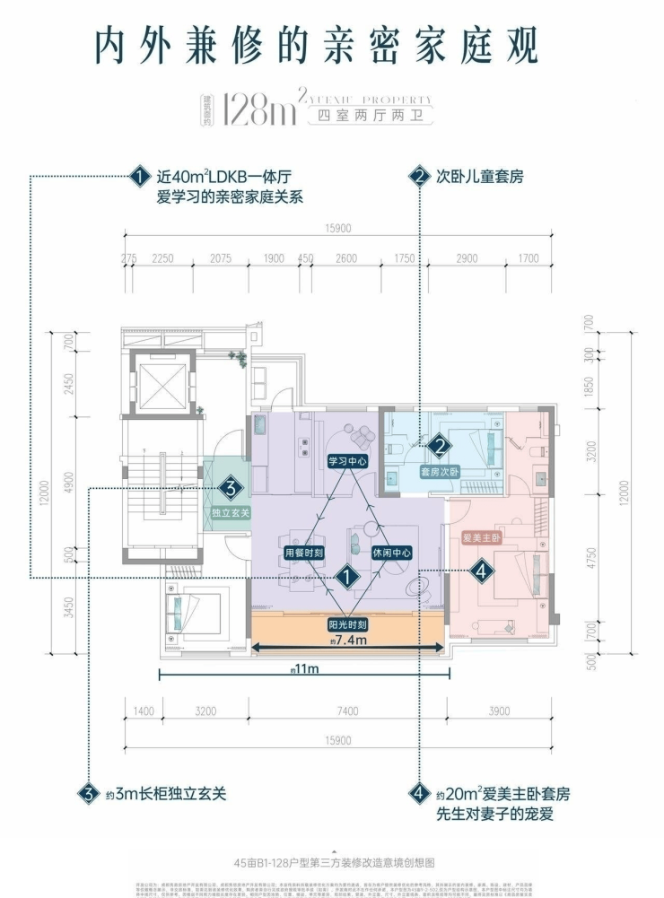 128㎡:四室两厅三卫,6.8米家庭交流厅+独立成长学习厅,得房率97%。