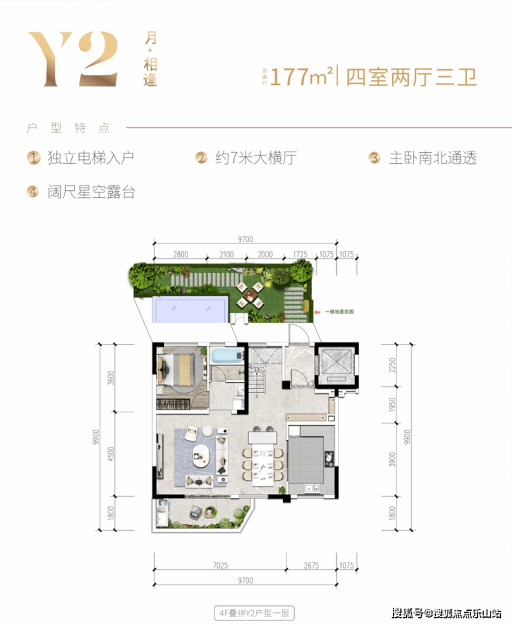 4F上叠(174㎡):赠送屋顶花园64㎡+独立电梯,7米横厅,南北通透主卧,适合改善家庭。