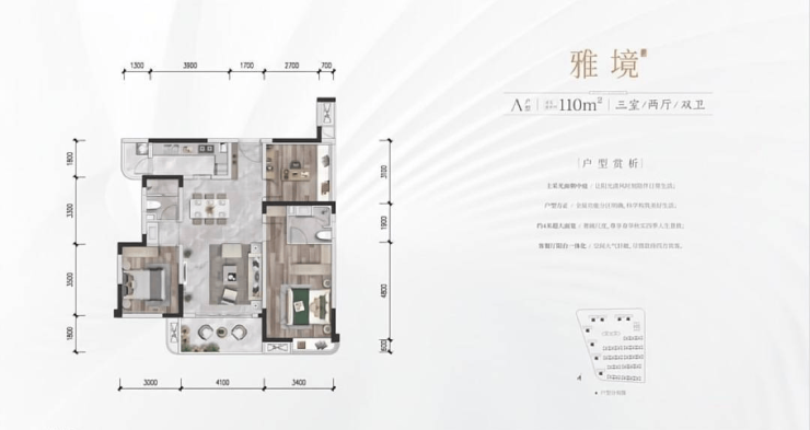 ?小高层户型:清水交付1、T3楼栋:14-17F舒适层高2梯3户;南北朝向;公摊18.0%【A雅境】:建面约110㎡,三房两厅两卫