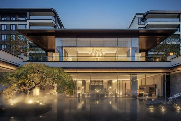 【外立面】现代雅致美学立面 立面均采用大面积定制玻璃,结合金属板、奢石,塑造多层次的灵动弧线造型,将时间的沉淀和韵味融入建筑整体。与白鹭湾湿地公园融为一体,温润儒雅久经传承。