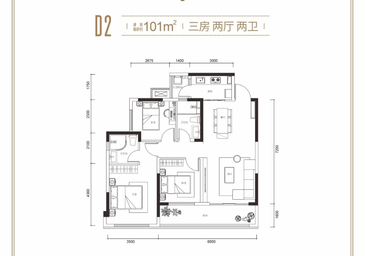 101㎡:三室两厅双卫,6.8米景观阳台,多功能可变空间