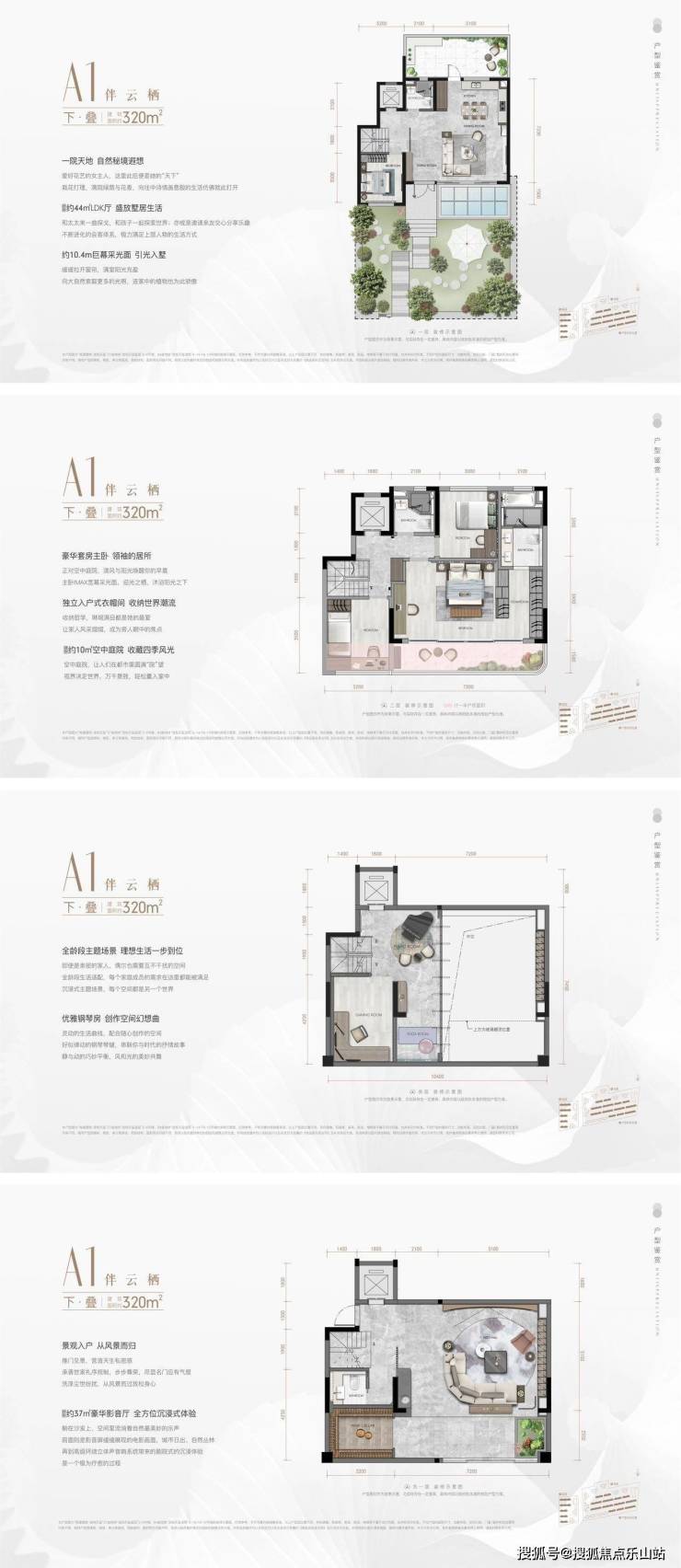 叠拼户型图:城市公园墅院【约310㎡-320㎡】4F上下真叠墅,户户花园配置。独立入户,尊享归家仪式感。一层一世界,一院一天地,显赫与栖隐,皆归于一席城市公园墅
