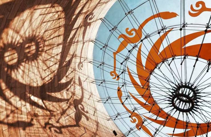 艺术空中廊桥取形于非遗装帧艺术“龙鳞卷”,外立面如书页般层层铺开,又有江水滔滔的流动之美