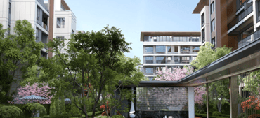 35%超高绿地率,楼间距达80米,打造"两轴一环一谷六园"多维森林景观。