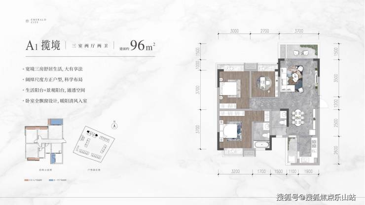 96 ㎡,2T4 三室两厅双卫 南北朝向,全飘窗功能三房,视野进阔,采光通透,21.09m²主卧套房,独立卫浴,前后双阳台,户型通透